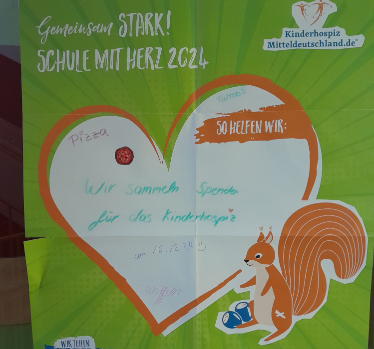 Dieses Jahr gab es wieder einen Spendenverkauf an unserer Schule. Die Klasse 10c unserer Schule hat mit einem Verkauf von Waffeln, Pizza und Tattoos 200 € eingenommen. Dieser Betrag wurde dem Kinderhospiz Mitteldeutschland gespendet, die mit ihrer Arbeit viel Gutes für die totkranke Kinder und deren Angehörige tun. Dieses Geld unterstützt sie dabei die letzten Tage besser zu gestalten.