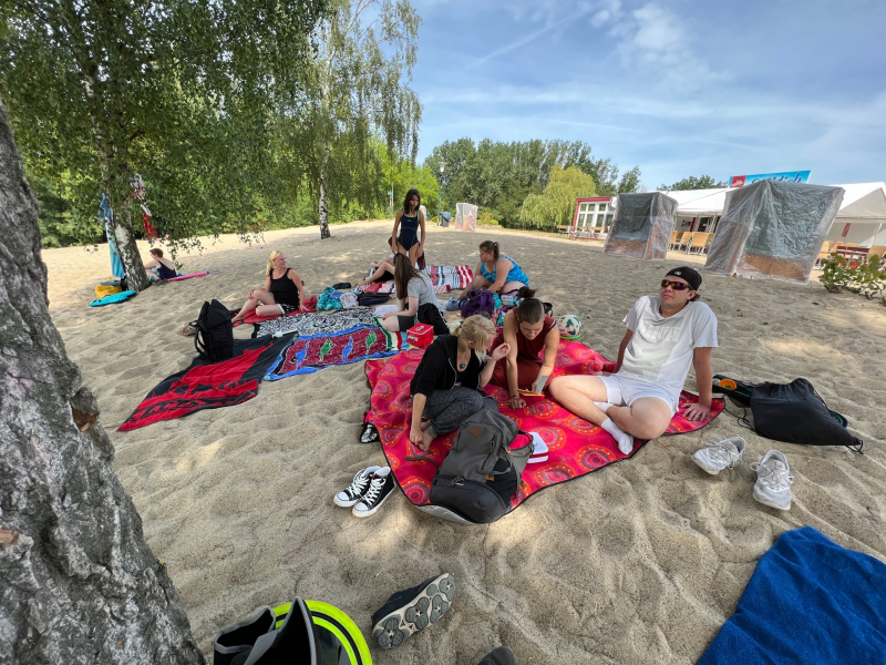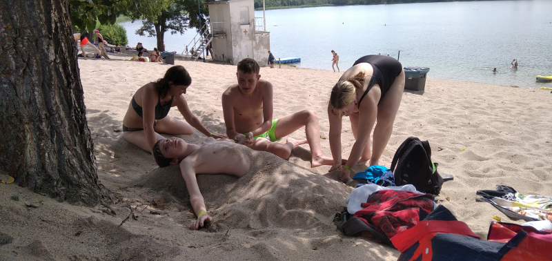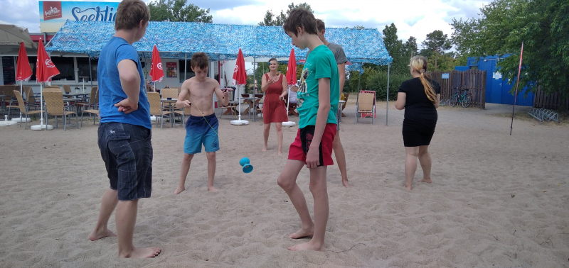 Während andere am Montagmorgen ihren grauen Arbeitsalltag begannen, saßen wir bereits um zehn idyllisch am Strand des Jersleber Sees. Bei gefühlten 40˚C in der prallen Sonne ließ es sich auch nicht anders aushalten. Neben Schwimmen und Volleyball spielen probierten wir gleich mal den neuen schwimmenden Kletterparcours aus. Und weil es so schön war, machten wir das am nächsten Tag gleich nochmal.